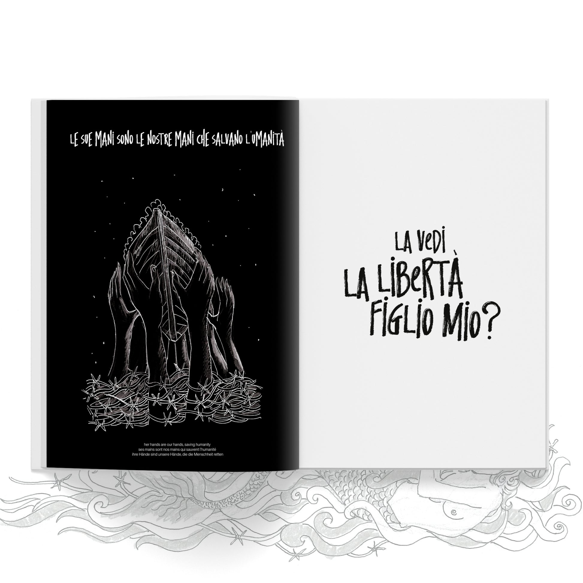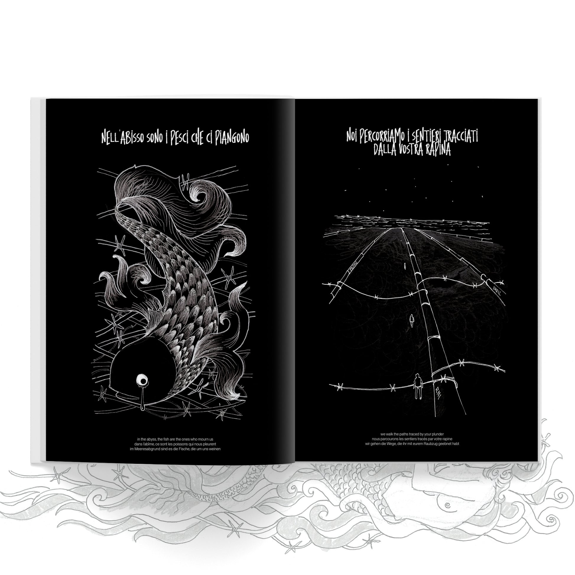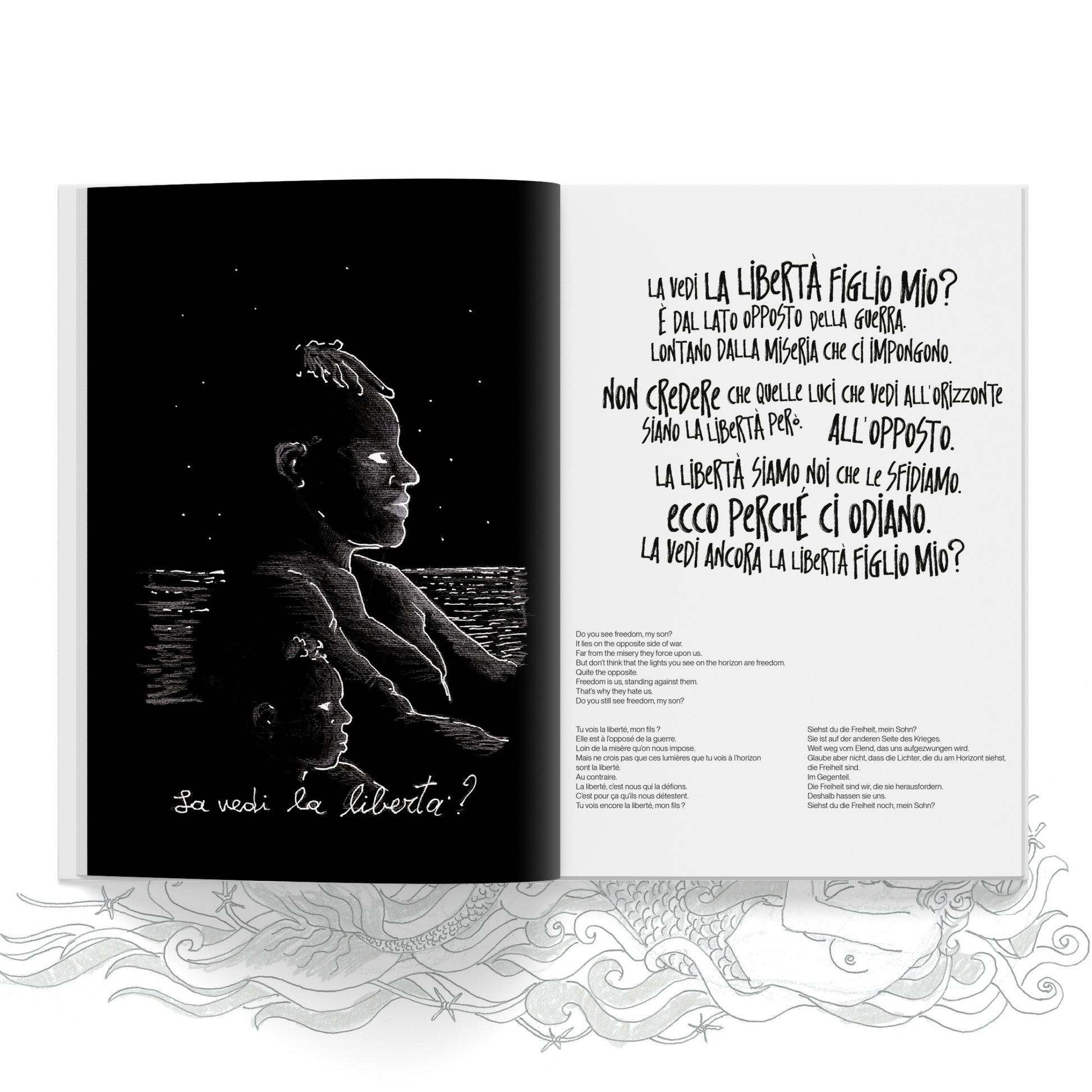 Dei buchi neri che inghiottono vita, memoria e verità, prodotti da un’ingiustizia così densa da piegare lo spazio e il tempo: le frontiere del Mediterraneo, dove la necropolitica dei governi occidentali decide chi può vivere e chi deve morire. In questo spazio-tempo distorto, dove il male si fa norma e l’indifferenza sistema, le tragedie del mare di ieri diventano le tragedie del domani - un domani che è già accaduto e che continua ad accadere.